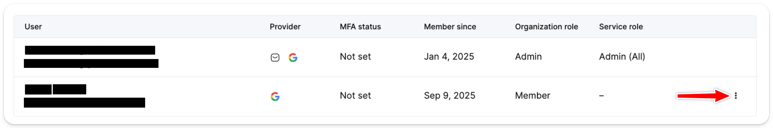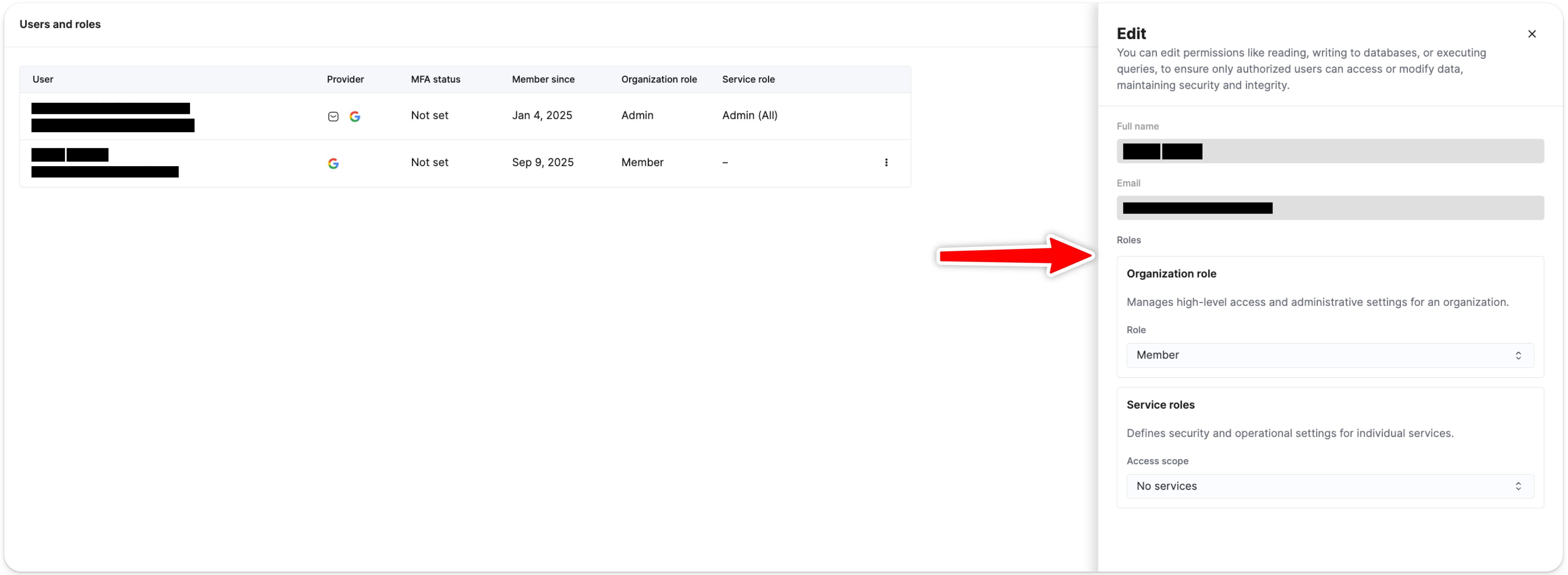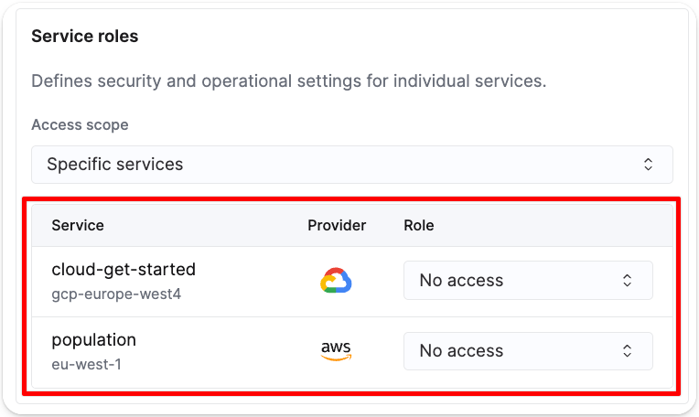 Select the drop-down menu items to adjust the access scope of the service role of the selected user. When selecting Specific services, you can control the role of the user per service.